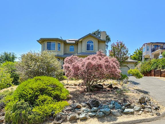 Fall in Love with 1st year interest rate available at 5.490% with lender subsidized financing. Incredible home offering panoramic views and plenty of natural light. Spacious open floor plan features a cozy living room with fireplace and large windows capturing the spectacular views. Enjoy meals in the formal dining room, complete with a pellet stove and treetop vistas. Chef's kitchen equipped with granite countertops, center island, stainless steel appliances, refrigerator, and wine fridge. Master suite offers stunning views of the hills and mountains, a luxurious bath with custom bathtub and separate shower. Two large bedrooms and landing area complete the upper level. Convenient first- floor bedroom, ideal for guests or home office. OWNED SunPower solar (9.15 kW) paired with SunPower battery storage totaling 48 kWh allowing the home to capture energy during the day and operate on stored power in the evenings. Full backup capability, enables the home to run independently in case of power outages for hours, or possibly days, depending on weather conditions. The large back patio is perfect for entertaining, with room to add a lawn, garden, or play area. Garage includes pass-through access to the backyard. The perfect blend of comfort, style, and views!