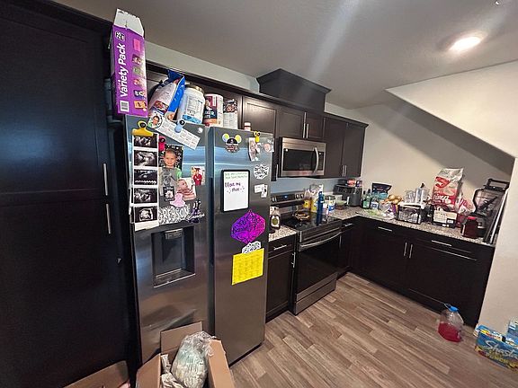 Floors are wood laminate and carpet. The kitchen features granite countertops and stainless steel appliances.