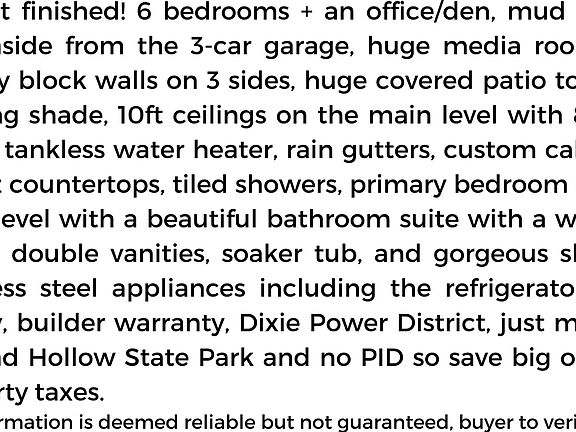 Almost finished! 6 bedrooms + an office/den, mud bench just inside from the 3-car garage, huge media room/loft, privacy block walls on 3 sides, huge covered patio to enjoy evening shade, 10ft ceilings on the main level with 8ft tall doors, tankless water heater, rain gutters, custom cabinets, quartz countertops, tiled showers, primary bedroom on the main level with a beautiful bathroom suite with a walk-in-closet, double vanities, soaker tub, and gorgeous shower, stainless steel appliances including the refrigerator, nice pantry, builder warranty, Dixie Power District. All information is deemed reliable but not guaranteed, buyer to verify all.