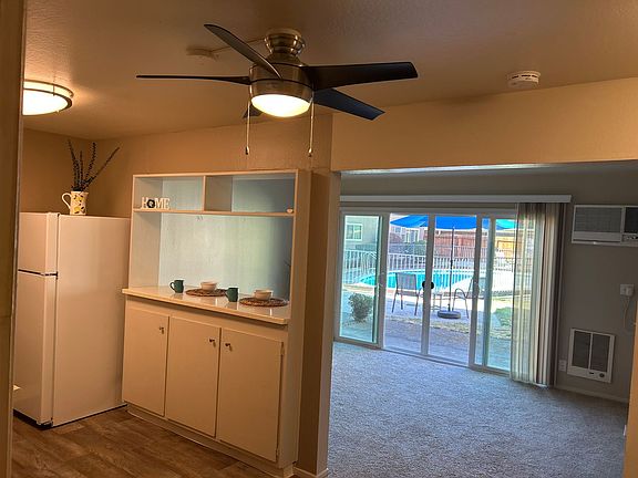 Now leasing this charming downstairs apartment, offering a comfortable blend of vintage charm and modern updates. Enjoy plenty of windows for natural light and a refreshing cross-breeze, complemented by a ceiling fan for added air flow. The home features modern golden wheat hued carpet in the living areas and wood-inspired flooring in the kitchen, entry hallway, and bathroom, plus a spacious open kitchen with a breakfast nook. A large sliding glass door leads to the landscaped courtyard and the sparkling poolperfect for cooling off on warm summer days. This all-electric apartment includes an electric wall heater in the bedroom, creating a cozy retreat on cool winter nights.
