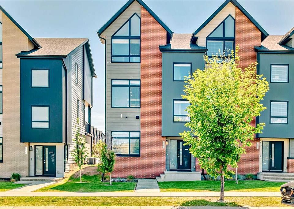 Former show home, the most stunning Townhouse you can find in the market WITH VIEW!! — An end-unit that fronts a green space!! This 3-bedroom, 2.5-bathroom home offers 1,782 sq ft of refined living space across three levels, and is nestled on a premium corner unit with no attached neighbor to the east, ensuring added privacy and natural light due to no common walls shared on that side. From the moment you step in, you’ll notice the superior quality and care that went into this property. The bright and airy open-concept main floor is perfect for modern living, with oversized windows, high ceilings, and upgraded engineered hardwood flooring. The gourmet kitchen is a true showstopper, featuring quartz countertops, stainless steel appliances, full-height cabinets, a stylish backsplash, and a large island with eating bar — ideal for both casual meals and entertaining guests. The upper level offers a relaxing retreat, with a vaulted-ceiling primary bedroom that includes custom windows, a walk-through closet, and a spa-inspired ensuite with a double vanity and luxurious quartz finishes. Two additional spacious bedrooms, a second full bathroom, and convenient upper-floor laundry make this a perfect layout for families or professionals working from home. On the lower level, a fully finished flex room — use it as a home office, gym, media room, or guest space. Additional highlights include CENTRAL AIR CONDITIONING, an oversized HEATED double garage, and a built-in EV CHARGING STATION, making this home both comfortable and future-ready. A back balcony with south exposure offers the perfect outdoor space for BBQs, and morning coffee. The roof of the entire complex was recently replaced in 2025, offering peace of mind for years to come. This home is part of a well-maintained and professionally managed complex with low condo fees. Located in the heart of sought-after Sage Hill, you’re just minutes from shopping, restaurants, parks, pathways, schools, and transit — everything you need for a convenient and connected lifestyle. Whether you're a young family, like to seek a modern lifestyle, or an investor looking for an upgraded turnkey property in a vibrant NW community, this one checks all the boxes. Don’t miss your chance to call this former SHOWHOME your next home — book your private showing today!