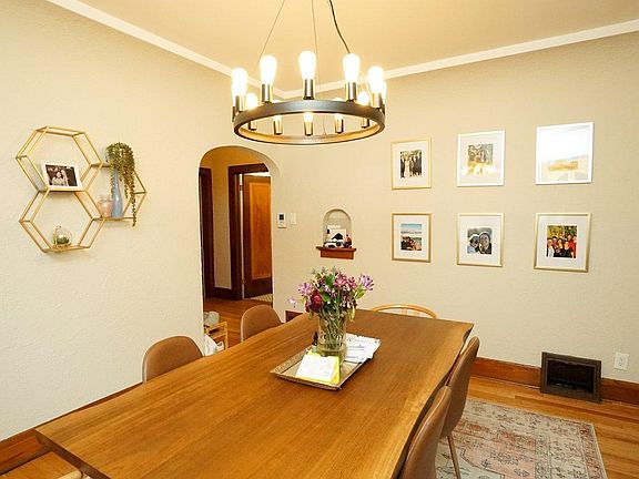 Old world charmWhite shaker-style cabinetsTudor-style duplexLarge dining roomSpacious kitchenOriginal leaded glass windowsArched doorways