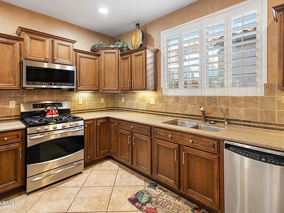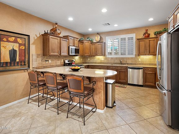 Welcome to this charming 2 bedroom, 2 bath home with a versitile flex room that can serve as a den/office or 3rd bedroom thanks to a convenient Murphy bed for guests. The oversized primary bedroom includes a walk in closet for ample storage. The Kitchen boasts gorgeous granite countertops with elegant cabinetry. The home has an open concept with abundant counter space and additional cabinetry in the laundry, that could serve as separate office space as well. The enchanting private fenced backyard is an oasis with citrus trees and stunning sunsets, perfect for entertaining guests or simply enjoying a peaceful morning coffee. Located in the Award Winning, Beautiful Trilogy at Vistancia conveniently located with access to both the Mita Club and Kiva Club.