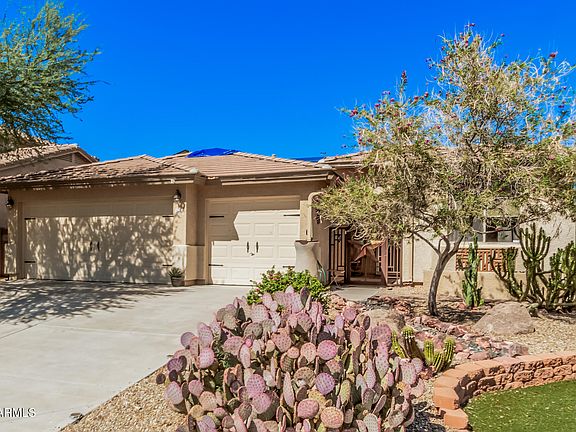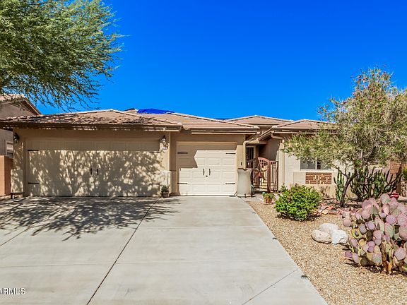 Beautiful home with POOL in Tartesso! Nestled on a corner lot, it offers 3 beds, 2 baths, 3-car garage, & a desert landscape. The inviting interior showcases tons of natural light, designer paint, tall ceilings, tile & wood-look floors in common areas, and soft carpet in bedrooms. You'll love the seamlessly flowing open layout, perfect for entertaining! The kitchen has a cooktop gas, wall oven & microwave, solid-surface counters, ample wood cabinetry, built-in desk, and a 2-tier peninsula w/breakfast bar. Versatile den just off the front entry. The main bedroom has sliding doors to the back and an ensuite with dual sinks. Enjoy the backyard oasis with a covered patio, extended pergola, well-laid pavers, fire pit area, & a sparkling pool for year-round fun! Plus SOLAR PANELS! Welcome home!