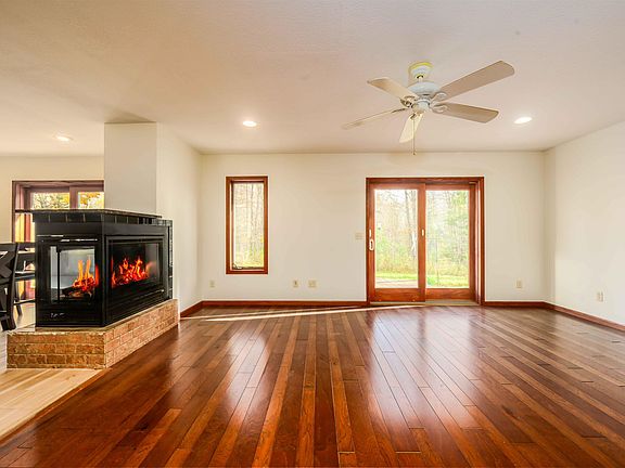 Discover this beautifully designed 4-bedroom, 3-bath home built in 2006, offering nearly 9 acres of serene country living in the quiet Lakewood area. With a thoughtful layout & one-level living on a heated slab, this home provides both comfort & functionality. The open-concept kitchen, dining, & living areas are centered around a cozy gas fireplace, creating an inviting space for gatherings. Patio door from both the living & dining rooms lead to a large rear deck-perfect for reading a book & entertaining while enjoying the natural surroundings. The unique floor plan offers privacy, with the primary suite on one side of the house featuring an en suite, while the opposite wing includes 2 bedrooms, a full bath with a relaxing sauna. On the second level there is an additional bedroom, an office area, & a Jack-&-Jill bathroom between them. The office area opens to its own private deck for a quiet retreat. Both garages are impressive-an attached garage & a detached garage/workshop, each fully insulated, heated, & equipped with in-floor heating. Perfect for car enthusiasts, projects, or extra storage. Additional features include a central vacuum system & in-floor heating throughout for year-round comfort. Surrounded by the tranquility of a garden bed, a creek, & many trees, this peaceful country living with modern amenities & room to roam. This home is pre-inspected. Call for a showing today!