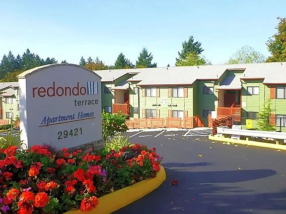 Welcome home to Redondo Terrace Apartments. We are a locally owned and professionally managed community in Federal Way, WA. Redondo Terrace is conveniently located, with close proximity to shopping at The Commons at Federal Way, dining, and easy access to Pacific Highway and I-5, you'll love the ease of commuting. Explore nearby parks, walking trails, and local attractions like Redondo Boardwalk, all within reach. We have 1- and 2-bedroom apartment homes. Our units offer exceptional value, boasting ceiling fans for added comfort, cozy fireplaces, and stunning scenic views. Enjoy the convenience of in-unit washers and dryers, brand-new modern interiors, and sleek stainless-steel appliances, including a dishwasher for effortless living. Step outside to your private balcony, and rest easy knowing we provide 24-hour emergency maintenance for complete peace of mind. Our pet-friendly community welcomes your furry companions and offers on-site parking for added convenience. Experience peaceful living while staying connected to everything Federal Way has to offer! Join us at Redondo Terrace Apartments and discover your perfect home in the heart of the Puget Sound.