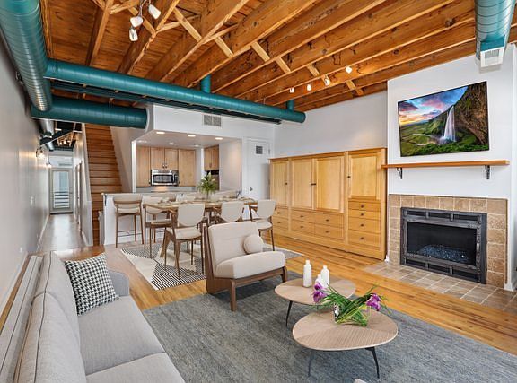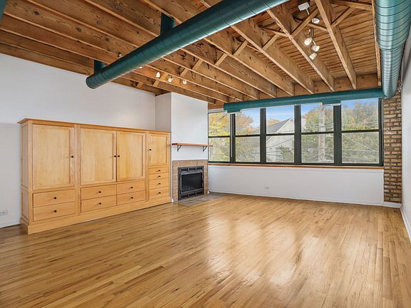 Bright and sunny three bedroom in the coveted Vinery Lofts in the heart of Lakeview. This impeccably maintained and spacious duplex-up floor plan is tucked off of Lincoln in a courtyard building and has exposed brick, timber ceilings, tall ceilings and hardwood floors. This is a great space for living or working from home. Main level features an open and updated kitchen with breakfast bar that leads to a living area with a gas fireplace with a custom iron screen and remote and beautiful built-in cabinetry, third bedroom or office with professionally organized closets, full bathroom and custom laundry closet. Second level has primary bedroom and bath and second bedroom both with generous closets. Additional features include a private deck with gorgeous city views, one garage parking space and one gated outdoor parking space included in price, extra storage locker and bike rack. Ideal location - minutes to restaurants, shops, Whole Foods, Southport corridor, Burley elementary school, parks and easy access to transportation, Steps to everything make this the perfect home.