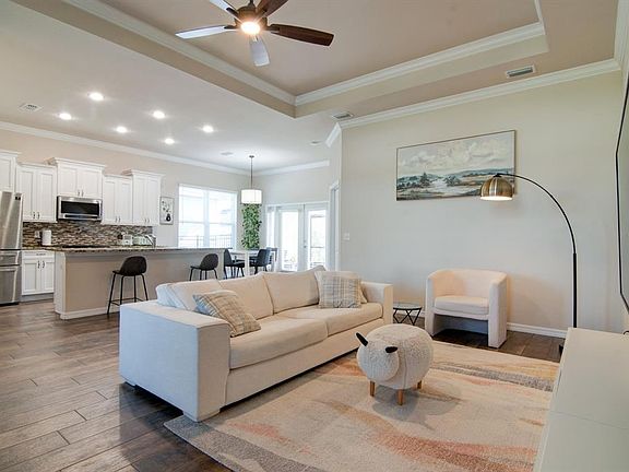 Welcome to this exceptional home built by Gainesville’s premier green builder, Tommy Williams. This popular "Kingston" model, built in 2020, blends energy efficiency with high-end design, offering both beauty and sustainability in the heart of Oakmont. From the moment you arrive, you'll notice the charming front porch and tasteful curb appeal. Step inside to soaring ceilings and a spacious open layout that feels even larger than the square footage suggests. The home is filled with upgrades, including wood-look plank tile flooring that runs seamlessly through all living spaces—kitchen, dining, great room, bedrooms, bathrooms, and laundry. The kitchen is a showstopper with rich maple cabinetry, granite countertops, stainless steel appliances, an eating bar, and a custom tile backsplash. The great room features a tray ceiling that adds architectural interest and elegance. Throughout the home, you'll find custom fans, blinds, and stylish decor colors that enhance every space. The luxurious master retreat offers a peaceful escape with a dual vanity, walk-in closet, and a European-style entry to the master shower. A huge walk-in pantry and thoughtful storage spaces add to the home's functionality. French doors lead to a covered and screened lanai that opens to a private backyard oasis, complete with paver patio, fire pit, and a fully fenced yard—perfect for relaxing or entertaining. A detached two-car garage provides ample space and convenience. As a Solar Standard home, this property boasts incredibly low utility bills through Clay Electric. Living in Oakmont means enjoying resort-style amenities including a clubhouse, zero-entry pool, fitness center, amphitheater, tennis courts, and more. This is not just a home—it's a lifestyle. Don’t miss your chance to own one of the most desirable models in one of Gainesville’s most vibrant communities.