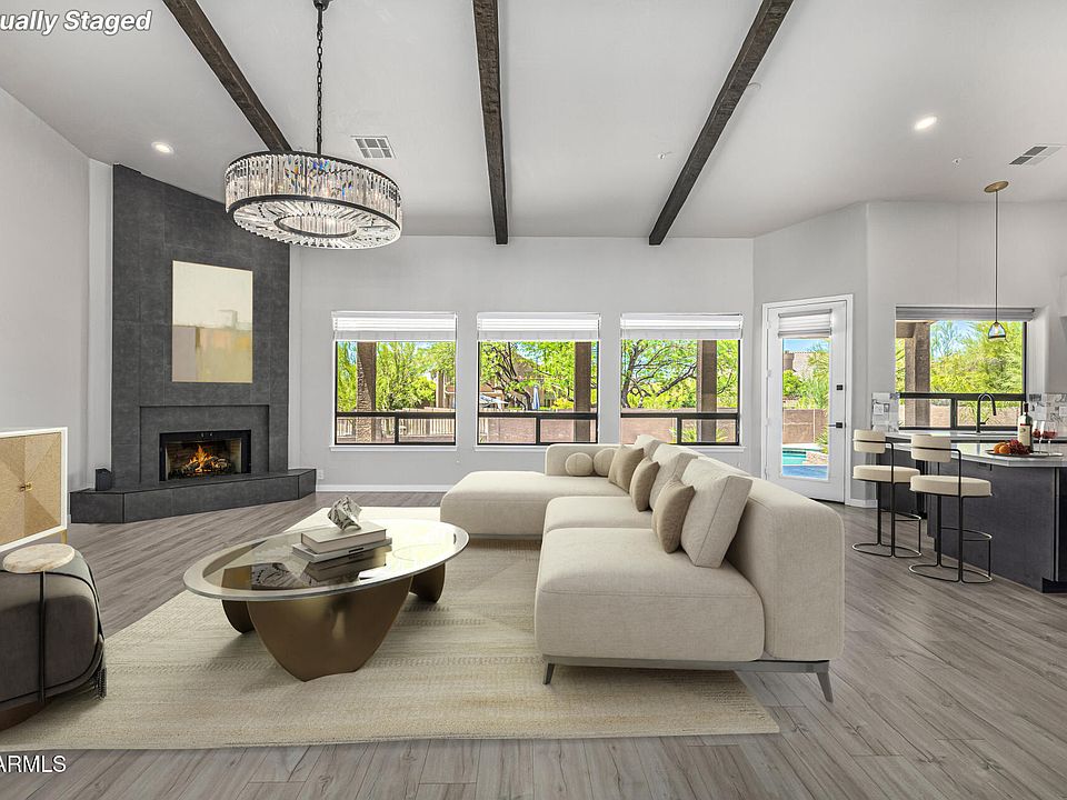 A rare blend of sophisticated elegance and comfort in the heart of North Scottsdale. Fully reimagined, single-level residence meticulously designed by Chai Lauren Ventures and styled exclusively with Restoration Hardware finishes. Premium 0.499-acre corner lot with mountain views, RV gate, wide-plank oak flooring, dramatic vaulted ceilings with wood beam accents, and curated lighting that sets the perfect tone. Custom blinds. Gourmet kitchen features custom cabinetry, quartz counters, a professional-grade appliance suite, and a statement island designed for entertaining. Enjoy Arizona living year-round with a sparkling pool and spa, new travertine decking, covered patio, firepit seating area, low-maintenance turf. Spacious primary suite with spa-like bath, custom walk-in closet.