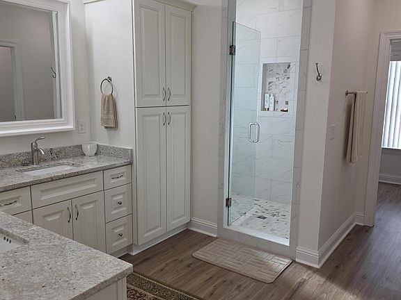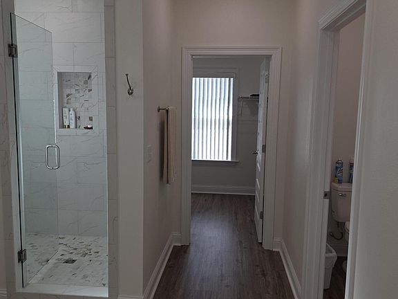 The primary suite is a true retreat, showcasing a large walk-in closet, spacious vanity, walk-in shower, and separate water closet for added privacy.