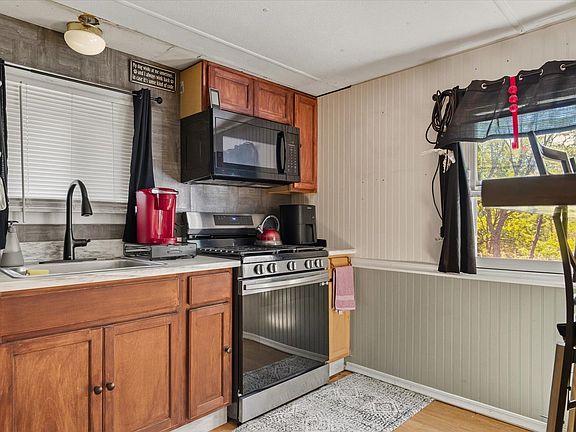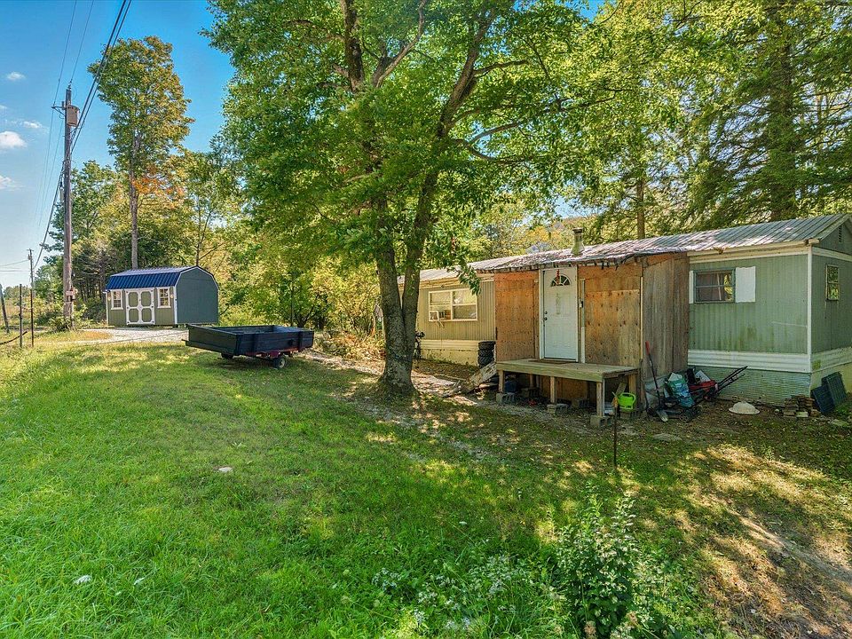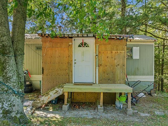 This manufactured home offers 2 bedrooms/1 bathroom with 900 sq. ft. of living space. Inside, you’ll find a living room, kitchen, and mudroom. The kitchen includes wooden cabinets and a mini-bar counter, while the living area features a fireplace and window unit A/C. Vinyl flooring runs throughout the home, with carpeted bedrooms and a dedicated laundry area. The property sits on 21.9 acres and is partially fenced with wire. The front entry has a white panel door with an arched window, currently enclosed by plywood boards as part of a temporary porch structure. A 10x16 rosemary-green shed is also on site, used for a four-wheeler and storage.