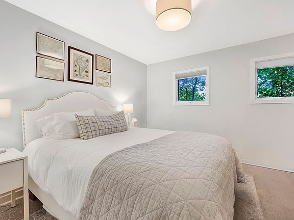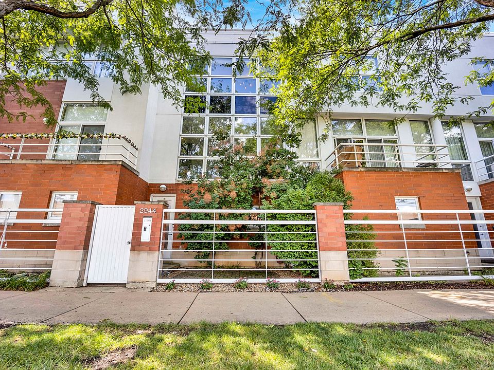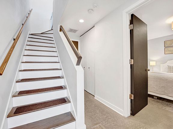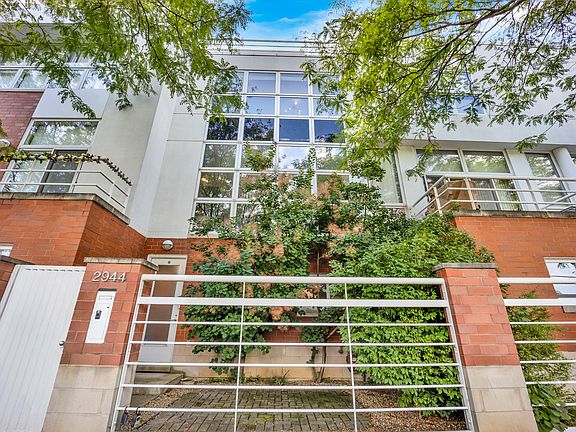 This modern home features 3 beds and 2.5 baths and is spread across 4 levels. It offers 4 outdoor spaces, an attached 2-car garage, and parking for 2 more cars. The kitchen boasts dark cabinetry, white quartz countertops with a waterfall edge, and stainless appliances including a Bosch dishwasher, Blue Star 30" gas range, and dual-zone wine fridge. The main living area is open and bright, showcasing hardwood floors, floor-to-ceiling windows, a fireplace, and space for dining. The third level holds two spacious bedrooms with custom ELFA closets and stylishly updated bathrooms. The fourth level is an ideal office space with access to outdoor areas. It can also convert into a fourth bedroom plus den.
