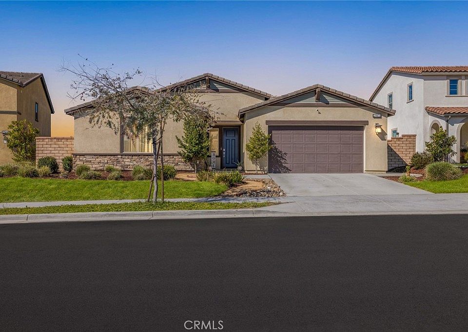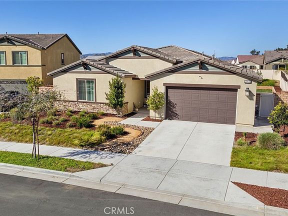 Discover the perfect canvas in this 2021 turnkey home, where fresh landscaping complements a spotless, ready-to-customize interior! The ranch style property is located in the highly desirable community of Audie Murphy Ranch, in Menifee. This barely lived in 2428 sqft home offers 3 bedrooms, 2 baths, an office and solar! As you enter the home you are greeted by tall ceilings recessed lighting throughout, crisp white paint, an open floor plan and endless options to create your perfect space. The property is appointed with two spacious secondary bedrooms with tons of natural light flooding the rooms, ceiling fans and plush carpet. They share a secondary bath with a dual vanity and tub shower combo. The large office is the perfect flex space with recessed lighting and a great option for a 4th bedroom. Across the hall is the large laundry room offering tons of storage and access to the 3-car tandem garage. The Great Room is extremely spacious with large windows allowing natural light to flood the home, plush carpet fills the space, and a blank canvas offers a multitude of opportunities to add your personal touch. The gourmet kitchen boasts granite counters, stainless steel appliances, white farm sink, a walk-in pantry and a large dining area. The master bedroom features views of the private yard and an attached bath boasting a super shower, dual vanity and large walk-in closet. The freshly landscaped yard is the perfect place to build a pool or landscape the yard of your dreams which is currently appointed with fresh grass and concrete that spans to both oversized side yards. The community amenities offer pools, spa, sports courts, hiking and biking trails, club house, meeting and banquet rooms, skate park, tennis, bocce ball and basketball. The community is home to the award winning Taawila ES, the new Kathryn Newport MS and is in between the 15 and 215 freeways, and super close to shopping. With the Temecula valley wineries 30 minutes away, Big Bear 1.5 hours away, SD an hour out and the beach an hour to the sand, this home is a must see!