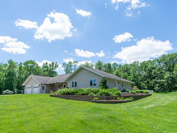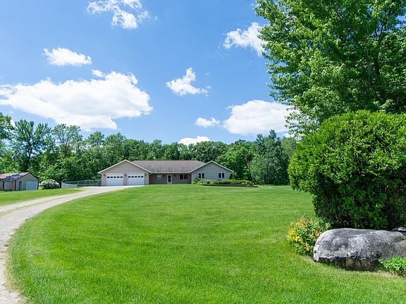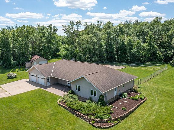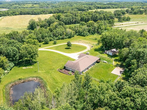 So much space inside & out in this 5 bedroom 2+ bathroom rambler that is like a patio home with everything you need on 1 level: All bedrooms & 2 full bathrooms plus laundry; open floor plan living/dining/kitchen area! In one wing are 4 same sized bedrooms with large bathroom featuring double vanity, the laundry room & a family room. On the other wing is the large owner suite w/ private bath/closet. Basement could be easily finished or enjoy the ample storage space it offers. Full bathroom could be added, currently just a toilet with the plumbing stubbed in. A few features to appreciate are the kitchen island, vaulted ceilings, fenced yards, optional wood boiler for in-floor heat with electric back up, newer well pressure tank, newer water softener and furnace, air exchanger, separate well for lawn irrigation system, front patio/porch and pond! Two pole buildings for more storage, attached oversized garage is sheeted and insulated & has an extra toilet not used. Much more to see!