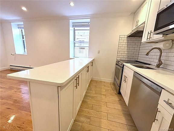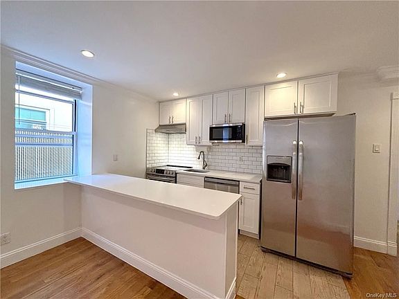 Welcome to this beautifully renovated three-bedroom apartment in the desirable Pelham Bay area of the Bronx. Located on the first floor, this unit boasts a modern kitchen equipped with sleek stainless steel appliances, quartz countertops, a subway tile backsplash, and a convenient breakfast bar, perfect for casual dining. The home features hardwood floors, beautiful upper molding, a marble-tiled bathroom, two generously sized bedrooms, and a third bedroom with a private en-suite bath. Freshly painted and with refinished floors, this apartment offers abundant closet space for all your storage needs, just unpack and settle in. Step outside to enjoy the covered patio, ideal for dining al fresco or simply unwinding with a book in the serene outdoor space. Nestled on a quiet, tree-lined street, this home is just moments from local shops, schools, parks, and public transportation, with Orchard Beach only a short drive away. Don't miss the chance to make this charming rental your new home! Additional Information: Landlord wants 750+ credit .