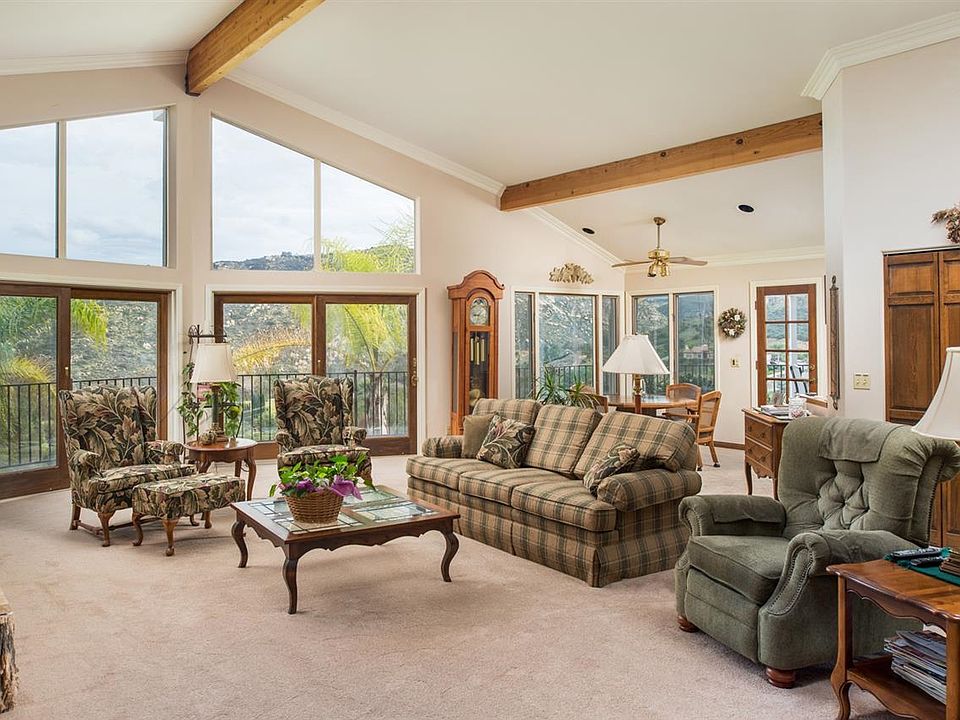3473 square foot custom built by the current owners. Expansive great room design with incredible views over looking Castle Creek Golf Course. Lives like a 1 story but has a 23' by 24' finished room downstairs with a private entrance and full bath. Could easily be maid's quarters, guest house, more bedrooms or ? Formal dining room with bay windows overlooking the view, separate laundry room with lots of cabinets, huge rock fireplace in the living room and nice sized secondary bedrooms. See supplement. This home also has commercial flowers and eucalyptus. On the freeway side of Valley Center and only moments to I-15. The Kitchen takes advantage of the views and features a walk in pantry. Gorgeous hard wood floors, high cathedral ceilings, 2 water heaters, skylights and tons of natural light, the two bedrooms have a Jack and Jill bath, Very private and the views can not be beat!