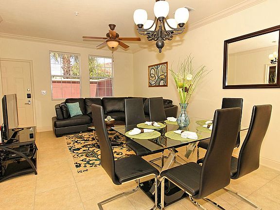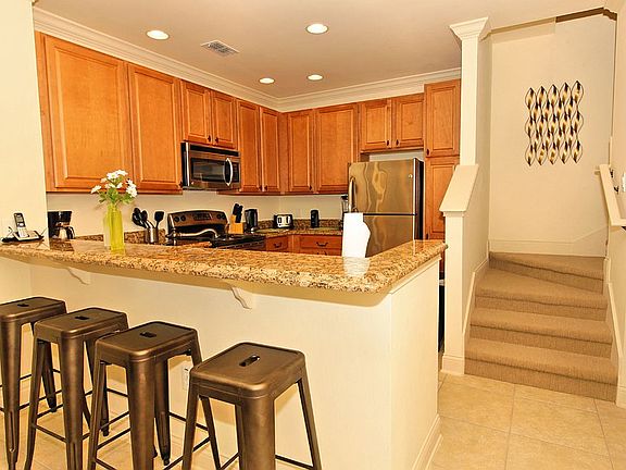 Beautiful Brick Driveway into this Community. This Gorgeous 3 Bedroom 2 Bath Townhome comes with Private Courtyard, Tile Roof, Granite Countertops, Stainless Steel Appliances in Kitchen, Ceramic Tile Flooring, Crown Molding, Jacuzzi Tub, Close to Disney, Minutes from Shopping. Fully Furnished, ready to be rented long or short term. Rent it out and Let it pay for itself when you don't use it. The Furnishings include TVs, Living room, Dining room and 3 Bedroom sets. Blinds, Rugs, Home Decor. All Appliances (fridge, dishwasher, garbage disposal, microwave, stove and washer and dryer) are included. Home has everything you need just bring your luggage. Champions Gate community golf course is only a couple of mins away. So close to I4 and right off Hwy 27, the Malls, Disney World, Sea World and Universal are only 15 mins away. Seller will pay 3% to buyer's agent.