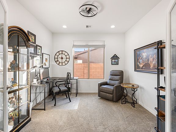 Located in the highly desirable Coral Canyon community with low HOA fees and fantastic amenities, this beautifully maintained home sits on an oversized .24-acre lot that extends 15 feet beyond the back fence and backs to open space — giving you extra privacy and room to breathe. Enjoy true outdoor living under the 750 sq ft covered patio with mountain views and immaculate landscaping — your own private retreat. Inside, the open-concept layout shines with natural Knotty Alder cabinetry, Corian countertops, and a cozy family room featuring a gas fireplace, new wood mantel, and custom built-in bookcases. A formal living room adds flexible entertaining space. Smart split floor plan with 4 spacious bedrooms + den/office with French doors. The 2.5-car garage includes custom cabinets, overhead storage, and an epoxy floor. Major bonuses: whole-home water filtration, recirculating hot water system, plus updated lighting and fans throughout. Space, upgrades, privacy, and views all in one of the area's most sought-after neighborhoods
