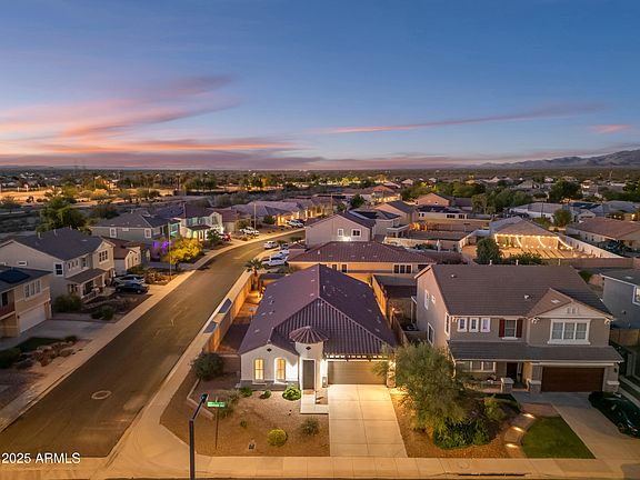 Stunning home with open split floor plan, bonus room, vaulted ceilings, 8 ft. doors, neutral paint, shutters, recessed lighting, Anderson windows, and walk-in closets in all bedrooms. Kitchen features 42'' ak cabinets, gas stove, granite counters, pantry, pendant light prewire, and center island with breakfast bar. Primary suite measures 16'1''x17'1'' and it showcases vaulted ceilings, patio access, tile flooring, walk-in shower, soaking tub, dual sinks, and custom walk-in closet. Resort style backyard has extended covered patio, multiple ceiling fans, built-in BBQ, Alumawood gazebo, travertine floors, and a 351 sq. ft. pool with water feature. One year home warranty included. Tartesso is a Master Planned Community and its amenities include schools, shaded parks, splash pads, tennis/basketball/volleyball/pickleball courts, soccer/baseball fields, ramadas, picnic areas, greenbelts, natural washes and miles of walking trails. Weekly Community Events feature food trucks to connect with neighbors and enjoy the stunning backdrop of the White Tank mountains.