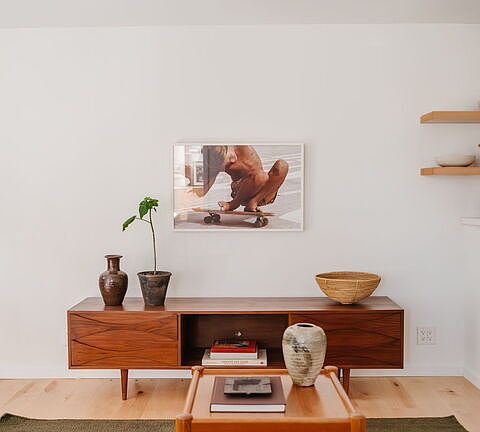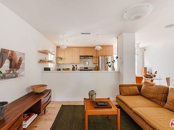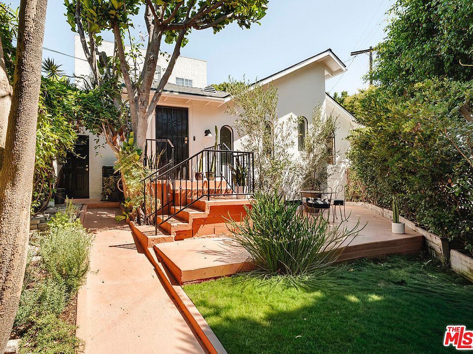 Set back from the street behind wood fencing and mature trees, this private 2 bed, 2 bath Silver Lake home offers 1,030 sq. ft. of elevated interior design, expertly curated outdoor space, and timeless architectural character. Ideally located, the cozy bungalow is a block from commercial offerings like Maury's Bagels and Psychic Wines, and a short distance from the Sunset Junction and Silver Lake Reservoir - a private retreat in LA's trendiest neighborhood. Past the front wooden gate, find the elegant yard, bordered by mature hedging and trees, with a grassy lawn and large patio ideal for home entertainment and outdoor dining. The front door opens to the open concept plan, with maple hardwood flooring extending throughout and light flooding in from arched front windows. The kitchen looks over the front living room, with a center peninsula allowing bar seating and conversation. Expertly appointed, the kitchen offers abundant cabinetry, quartz countertops, floating shelves, and plenty of room for cooking and hosting. Adjacent, the dining nook is anchored by a striking Entler chandelier, with sliding glass doors to the back that fill the main living space with sunlight. The gorgeous upstairs bedroom features a large front curved window with views of greenery, and is outfitted with a custom built-in bookshelf and desk, and a spacious closet. The dramatic ensuite bathroom features amber Zia zellige tile extending from the floor through the shower, and a refined slatted wood vanity with striking bulbous sconces. Stairs lead down to the primary bedroom, with a custom, pull-out closet and charming ensuite bathroom with a square tiled shower and bathtub. Additional features include a dedicated laundry and storage room, a gated side driveway, and a front courtyard perfect for alfresco dining. Comfortable and chic, the home is a rare offering in the heart of Silver Lake.