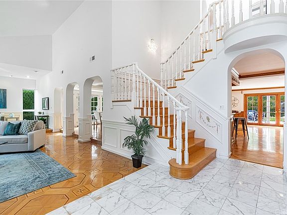 Inside this luxurious Beverly Hills home the elegant foyer, grand staircase, breathtaking chandelier, and high ceilings set a dramatic tone for the rest of the house. The luxury continues into the spacious formal living room with fireplace, high ceilings, and beautiful parquet floors. Three archways connect the living room to the formal dining room with coffered, mirrored ceiling and french doors to a private side patio. Continuing through the dining room is the chef's kitchen with top of the line appliances, plentiful counter space & cabinets, large center island, additional dining area, and doors that open to the patio, creating the perfect indoor/outdoor experience. Off of the kitchen is the expansive family room and wet bar, lined with french doors overlooking the patio and pool. Perfectly located for guests downstairs is a private bedroom with a jack and jill bathroom. Up the grand staircase is the private master suite featuring vaulted ceilings, a fireplace, and separate sitting area. The ensuite bathroom offers his and hers vanities, sauna, jetted tub, and walk in shower. Also attached to the master is an enclosed patio perfect for a home gym, office, or studio. The backyard features a pool with rock waterfall cascading down the hillside, multi level patio space, and a sports court. No details were spared in this opulent Beverly Hills home.