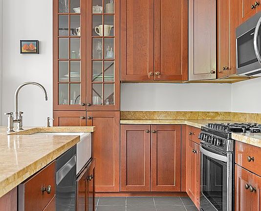 A gracious entry foyer leads you into the building and up to the first level of the apartment, where an airy, open-plan living area awaits. Anchored by a wood-burning fireplace and framed by three oversized windows overlooking the street, the space flows seamlessly into a dining area generous enough for a table of six or more. The thoughtfully designed kitchen is equally suited for family life and entertaining, with abundant cabinet storage, granite countertops, a large island with integrated sink, and a suite of stainless steel appliances. This floor also includes a spacious bedroom and full bath.