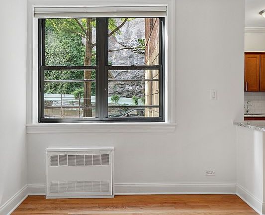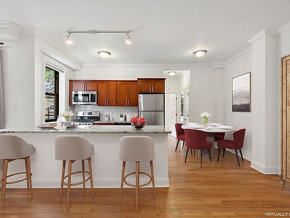 Picturesque and protected views of majestic cliffs in beautiful Fort Tryon Park provide the perfect, tranquil backdrop for this welcoming home. Quietly situated along Bennett Avenue with pretty greenery from every window and gorgeous natural light streaming in all afternoon. Enjoy the open, easy floor plan with a renovated kitchen at the heart of it all featuring abundant shaker-style cabinetry, new stainless-steel appliances, granite counter tops, subway tile backsplash and a huge breakfast bar perfect for entertaining guests. The L-shaped living space provides flexibility for dining, work and relaxing. Both king-sized bedrooms are full of light, nature and offer abundant closet space as well. The windowed bathroom features a soaking tub, pedestal sink and medicine cabinet. Throughout this freshly refurbished and newly painted home are hardwood floors, high ceilings adorned with crown moldings, generous closets and super LOW MAINTENANCE! All this plus living with NO NEIGHBORS BELOW YOU make this an irresistible offering.