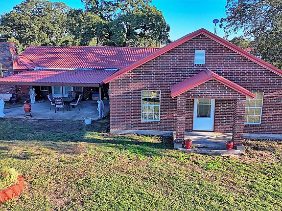 37.61 acres featuring a brick home with a metal roof, two bedroom, two bath total, screened-in porch, and covered front porch. Interior includes a spacious kitchen with bar, laminate flooring, living room, dining area, and breakfast nook. Large bathroom with tub and shower, oversized laundry room, and an office area. Bedroom with rock fireplace and private bath. Exterior features include a 2-car carport, fenced and cross-fenced acreage with coastal grass, one pond, scattered oak trees, old cattle barns and pens, and a shop with concrete floor and electricity. Rolling terrain offers beautiful views with large oak trees overlooking a serene stock pond with county road frontage on two sides.