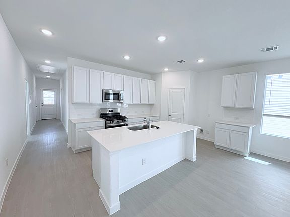 Be the first one to live in this brand new home in beautiful Kyndwood - the masterplan community in New Braunfels. Conveniently located off I-35, exit 193/194, overlooking Mayfair and Buc-ee's, easy access to major hwys, easy commute to San Antonio, San Marcos, New Braunfels and Austin. This one-story elevated Eventide collection home features 9-foot ceiling, 4 bedrooms, 3 full baths and 2 car garages. Open floor concept with vinyl plank flooring throughout all common areas, and carpet in bedrooms. Spacious modern kitchen with quartz counter tops, stainless steel appliances including stove & oven, combination vent hood/microwave, dishwasher, and garbage disposal.The luxurious owner's suite is nestled into a private rear corner, complete with a full bathroom and walk-in closet. A secondary suite with a full bath is an ideal layout for in-laws or guests. Take the advantage of enjoying a covered patio and quiet backyard to entertain the whole family. The community facilities include a full gym, swimming pool, playground and pickleball courts. Small to medium size pets are welcome. Fridge can be provided. Reach out for more details. This is a MUST see!