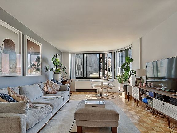 An entry foyer leads past a fully equipped pass through kitchen into an open, sun drenched living room with dining area, featuring a curved wall of over-sized windows that gives the building its recognizable turreted profile.