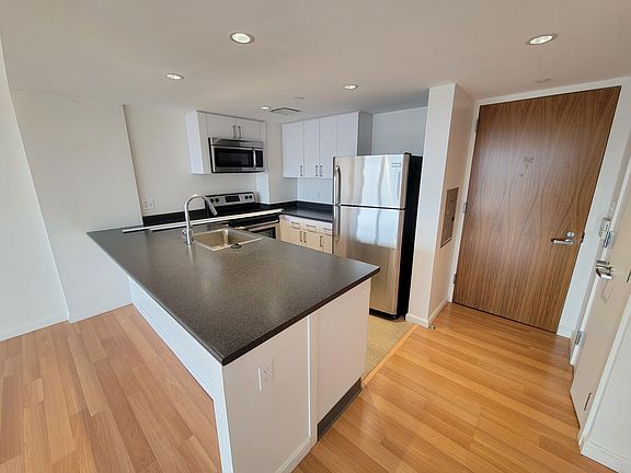 Luxurious second floor one bedroom apartment in a mid-rise building close to Central Square. Open floor plan kitchen/ living room. Kitchen with modern stainless steel appliances, dishwasher, electric stove, plenty of countertop space. Living room has a/c which open to a spacious porch with great city views. Large bedroom with ample closet space. Hardwood floors throughout, efficient electric heating. Coin-op laundry and a small gym in the basement. Garage parking available for rent.