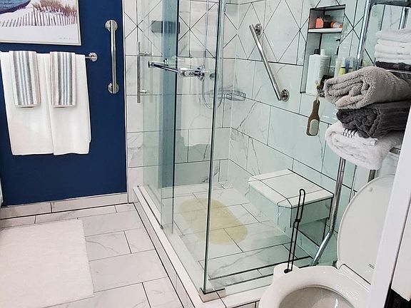 o Full Bathroom - Upstairs: New glass shower doors & tile floor.