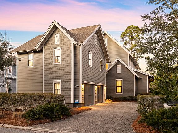 Situated in an exclusive gated community, (the best kept secret along 30A), 295 Plimsoll Way offers premier access to the lifestyle and amenities of the Watersound West neighborhood. Positioned on the community's lake and within a 5 minute walk to the private beach walk-over as well as the community pool; this property provides an unparalleled approach to the natural resources, sugar white sands and emerald waters of 30A's coastal beaches. Siituated alongside the state park and boasting a private beach for the neighborhood residents, the access to the emerald waters is one of the most unique on 30A. The contemporary design features an expansive and open living space that seamlessly connects the kitchen, dining area, and living room. The Chef's kitchen showcases and oversized island and premier appliances. Step outside and an outdoor living area highlighted by a relaxing screened-in porch and soothing fire feature. This area leaves plenty of space for the addition of a pool if a future homeowner desires. The opulent primary suite, found on the main level, presents an extravagant bathroom adorned with a double vanity, a custom-tiled shower, complete with a spacious walk-in closet. A powder bath and laundry room with two washer/dryer sets complete the main level. Up the stairs, you will find three additional bedrooms, complete with two full baths as well as an additional sitting area. Views of the water are enjoyed in numerous rooms on this level. Custom tile flooring is situated throughout the house which is a dream to maintain at the beach. In he attic, there has been framing laid out to allow for the addition of a spiral staircase to a top floor loft/lounge. This would add an additional 500sq ft to the home for a future owner.