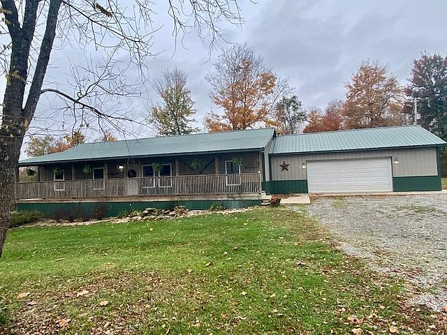 Privacy ion 15 acres! Recently updated, unique, trending pole barn style exterior look home with covered front porch for your rockers overlooking mature trees and beautiful fields. This 4 bedroom, 2 bath home offers an expansive, open living/dining/kitchen combination with hand scraped hickory floors and tall wood paneled ceilings with recessed lighting. Kitchen has tons of counter space, large island and tons of custom, hickory cabinets, walk-in closets in all bedrooms and a custom, tiled 2 person spa shower in the master bedroom. Spacious 32X24 attached garage, 24X12 back deck with pergola, landscaping, small koi pond, deer and wildlife heaven.