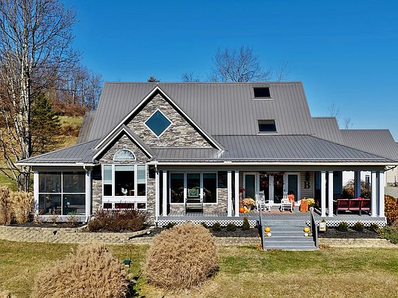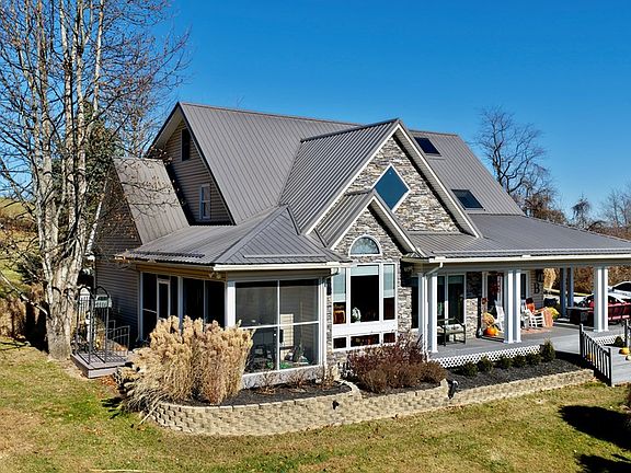 Must-see gorgeous home perfectly situated on 2.5 private acres with absolutely breathtaking views that stretch for miles in every direction. This peaceful and secluded property is surrounded by natural beauty, offering abundant wildlife and a true sense of escape while still providing all the comforts of home. Enjoy slow mornings with coffee and unwind in the evenings with your favorite beverage on the spacious covered porches found on the front, side, and back of the house, each providing a different perspective of the stunning landscape. The impressive 1,100+ sq. ft. detached garage offers exceptional storage space for vehicles, equipment, and all your recreational toys, making it a dream setup for hobbyists or outdoor enthusiasts. Inside, the home features beautiful hardwood flooring throughout the main living area, custom tile showers, and a custom kitchen designed with both style and everyday functionality in mind. The layout includes a great room and a separate living room, giving you multiple areas for entertaining, relaxing, or enjoying cozy evenings at home. A remote-controlled fireplace adds warmth, ambiance, and convenience, creating the perfect atmosphere for year-round comfort. This remarkable property blends craftsmanship, charm, and natural scenery into a rare find that truly feels like a private retreat.