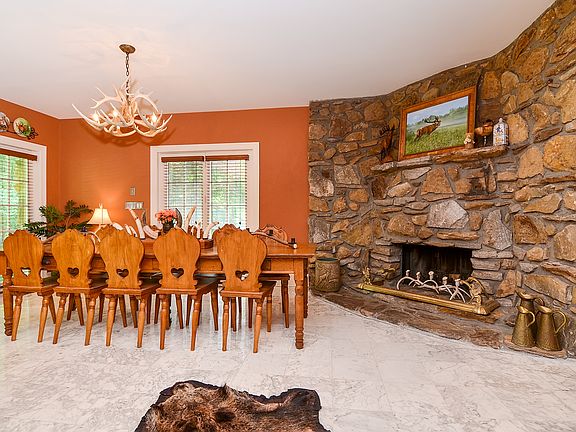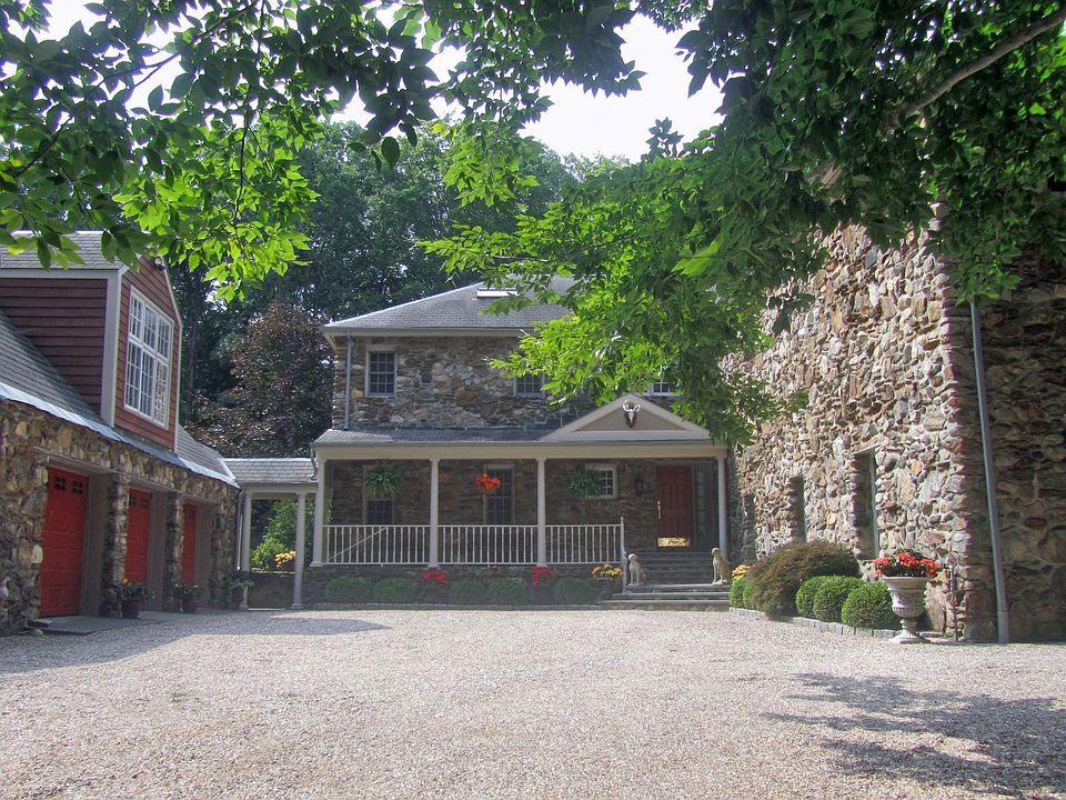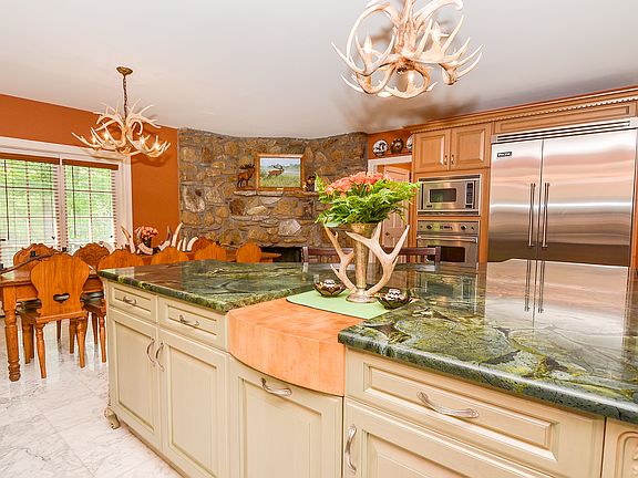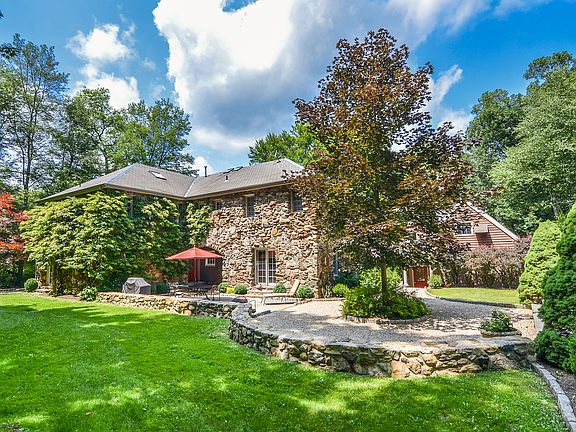 BUCKSTONE HOUSE. Fashioned after a 19th century European hunting lodge, this stunning 1988 stone country house is sited on over 4 private acres. Enter through the stone pillars and meander down the long driveway to a formal courtyard. The home has over 6100 square feet of beautifully scaled rooms with extraordinary attention to details that blend old world craftsmanship with modern amenities. A two story entry features murals on the walls and hand painted accents. The living room is 39x 24 with a 12 coffered pine ceiling and massive floor to ceiling stone fireplace. Two additional floor to ceiling stone fireplaces anchor both the dining room and gourmet kitchen which features Viking appliances, Neff cabinets, and granite counters. The library with incredible art deco detailing opens to a lovely stone terrace through French doors. The elegant master suite with tray ceiling and fireplace also includes a dressing area with walk-in closet, built-ins, and a separate sitting room/office with fireplace. The guest bedroom boasts a hand painted ceiling and an en-suite bath along with 3 additional bedrooms and another full bath. An au pair/office with full bath sits above the 3-car garage. This exceptional property has 3 stone terraces, landscaped gardens, and a heated Shoreline pool and spa. Experience Europe in America!