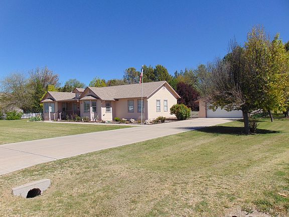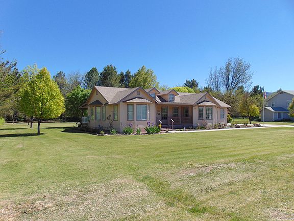 Country architecture with lots of trimmings! The floor plan is split with a hobby/office room off the master. The home comes with bay windows and dormers in the great room. A beautiful gas fireplace accents the living/dining room. The kitchen is large, and centrally located with eat-in dining. The guest bedrooms share a full bath in addition to a 1/2 bath off the kitchen. Let's not forget the basement which has a built-in entertainment center, and a large storage closet. The double garage comes with a very large shop, and continues into a big area for keeping your gardening equipment. The acre is flood irrigated, and has many fruit and nut trees. There is a large fenced area for your pets. Both front and back porch are covered, and have great views. The location is close to town.