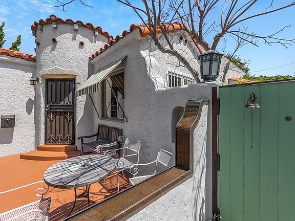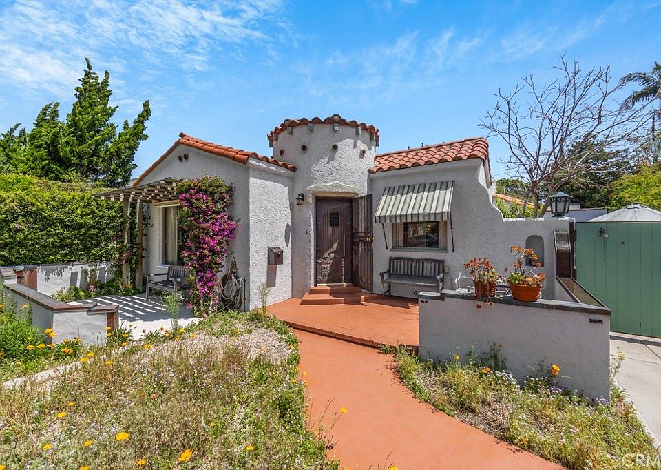 Classic Spanish beauty located on highly desirable Eucalyptus Ave in Wrigley. A tranquil, low traffic, tree lined street with mostly single family homes offering plenty of parking. A highly sought after commodity in the area! Enjoy your morning coffee on one of two front patios gazing at the flower filled garden with two soothing water features. Enter via the handmade brass paneled front door into a coved ceiling living room highlighted by