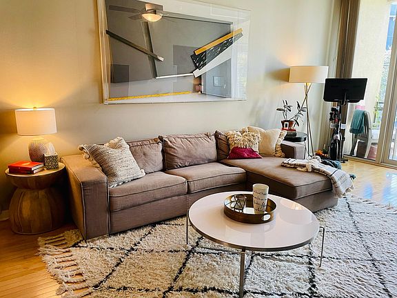 Wonderful 2-2 top floor corner unit. Open, light and bright floor plan. Fully furnished with all utilities paid. Spacious kitchen with granite, stainless steel appliances, breakfast bar - open to living and dining areas. Master suite has no adjoining walls to other units! Spa like master bathroom with dual vanities, large tub and separate shower. Walk-in closet with custom shelving. Generous guest suite with full bathroom. Other amenities include; hardwood floors, custom tiles and granite in bathrooms. also included are 2 non- tandem parking spaces (gated), storage unit plus pool in building. Walk to restaurants, shopping and more.