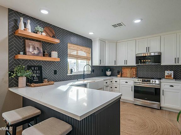 This gorgeous modern ranch Farmhouse in northern Mesa with white-washed brick trim on an oversized 9,415 sf lot across from the park checks ALL the boxes! Thoroughly and recently renovated offering a wealth of high-design features and charm in a turn-key package for the discerning buyer. Incredible open and bright floorplan with high vaulted ceilings features 3 bedrooms, a HUGE den, 2 baths and a beautiful dining area with bay windows and custom accent walls throughout. Remodeled magazine-worthy chef's peninsula kitchen designed for serious cooking with fabulous quartz counters, herringbone backsplash, farm sink, luxurious appliances including a smooth-top range, a built-in microwave and refrigerator boasting gorgeous white soft-close Shaker-style cabinetry with attractive hardware and crown molding with the perfect breakfast bar and wall pantry. The ideal blend of wide luxury vinyl plank flooring, 7" baseboards, smooth ceilings, recessed LED lighting, updated dual pane windows (2024), custom window treatments with wood shutters, three hand-made steel doors, a cozy brick fireplace, updated interior doors, updated A/C (2022), fresh interior/exterior paint and a relaxing front shaded porch further enhance the home. Spacious master retreat with a large walk-in closet and an updated spa-like bathroom enjoying a dual-sink granite vanity with a shiplap accent wall and a well-appointed 3/8 glass shower with incredible tiled surrounds. The stylishly remodeled guest bathroom also adds to the amenities along with an outstanding laundry room enjoying ample storage cabinetry. Private north/south lot featuring a nice covered patio with extended pavers and lush landscaping with productive citrus trees. You will enjoy the roomy two car garage with its recessed workspace and convenient side-door exit with an RV gate and parking area. Excellent neighborhood location provides you with amazing access to the park, boutique shopping, coffee shops, popular restaurants, excelling schools and convenient freeway access!