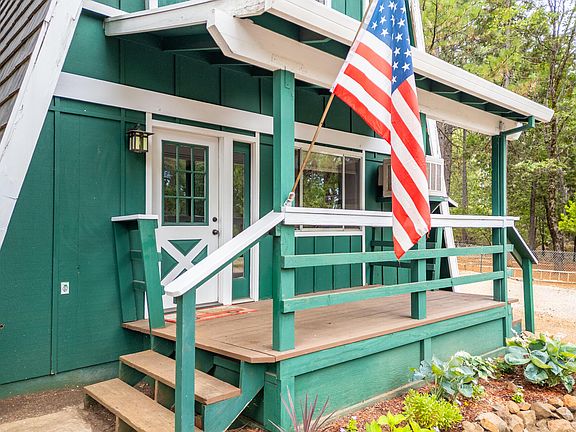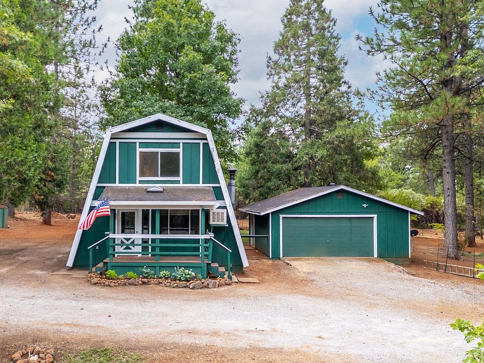 Discover charm and character in this inviting 3 bed, 2 bath A-frame home situated on nearly an acre of pine-studded land. Light and bright throughout, the interior features updated flooring, fresh paint, a cozy wood stove, and an evaporative cooler for year-round comfort. The spacious primary suite offers dual closets, while the updated kitchen includes a new faucet and water heater. Enjoy peaceful mornings and evenings from the covered front and back porches overlooking a lush, landscaped backyard. Fruit trees—apple, almond, peach, lime, and lemon—dot the property, adding to its serene appeal. A detached 2-car garage and generator-ready wiring offer added convenience. A truly unique and peaceful retreat with personality to spare!