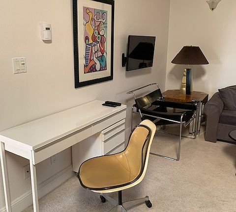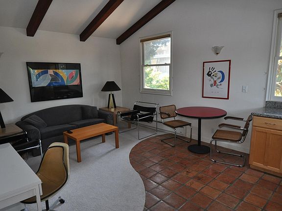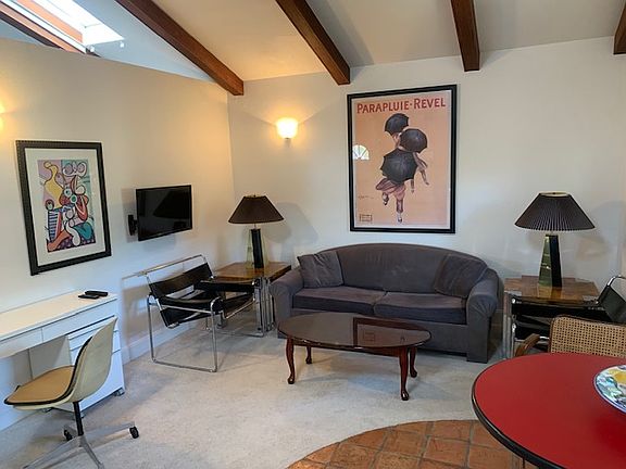 Ideal for one person, this one-bedroom, second-floor level unit is located above a detached double-car garage, which is about 50 feet behind the main two-story house and about 80 feet from the street and sidewalk. You enter the property on a long driveway through an electrically-operated gate, which offers additional privacy and security. The main house and apartment unit are near the landmark Claremont Hotel in Berkeley. This turn-key, move-in apartment is completely furnished and available for immediate occupancy. This is an extremely private and quiet rental unit in an upscale, safe neighborhood. You would essentially be living in a "Carriage" style single family dwelling. It features the following: