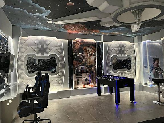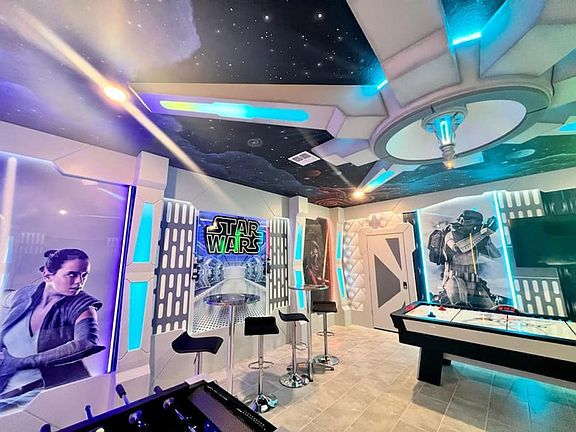 Experience luxury and entertainment in this 9-bedroom villa featuring 7 uniquely themed rooms, a private pool, hot tub, and unobstructed lake views. Enjoy the Avengers movie room, Star Wars game room, and themed bedrooms including Harry Potter, Frozen, Toy Story, Moana, and Mickey. Located just 7 miles from Disney and 12 miles from Universal Studios, this gem is ideal for families and those seeking a luxurious and fun vacation that will be memorable for a lifetime. The villa requires a refundable security deposit of 1000 USD for potential damages. Grilling is not allowed on this property, including rented grills. Check-in and check-out times should be respected. Shoes should not be worn inside; use the shoe cabinets provided. Smoking, vaping, and illegal substances are prohibited indoors. Only registered guests are permitted, and no parties or events are allowed. Quiet hours are between 11 pm and 7 am. Meals should be enjoyed in the dining room and kitchen, with no food or drinks in the bedrooms. Handle furnishings, decor, art, and house fixtures carefully; any damage beyond the security deposit will be charged. Report any damages immediately. For safety, no open flames or candles are allowed. Trash should be bagged and placed in the brown trash container outside the front door, collected twice a day. Do not move or rearrange furniture or accessories. No drawing or scribbling on walls or wallpapers. Do not attempt to adjust pool equipment, HVAC units, electrical breakers, or routers; contact us for any issues. Violating these rules and causing any damages may result in fines depending on damages caused. Treat this property with care. Upon checkout, turn off lights, fans, AC, TVs, appliances, and electronics. Keep all linen in their respective bedrooms, leave all TV remotes in their respective rooms, close all water outlets, sign out of streaming accounts, close and lock all doors and windows, check for personal items, place used towels in bathroom laundry baskets, and dispose of all trash in the outdoor container.