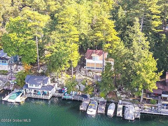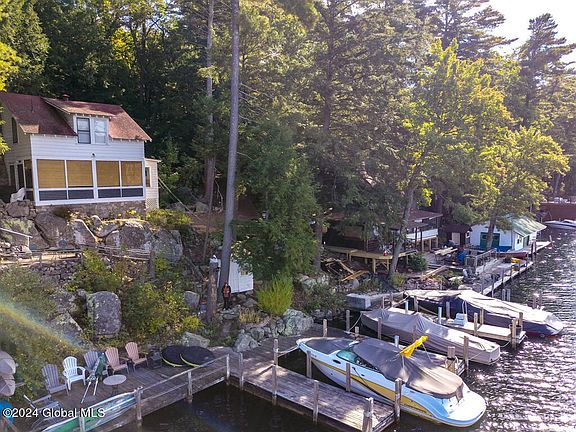 Escape to your perfect summer camp on Lake George! This charming 3-bedroom, 1-bath home offers a long season of enjoyment. Relax by the cozy stone fireplace or soak in the beauty of the old wood floors. Newer kitchen complete with butcher block counter tops. The pre-existing oversized U-shaped dock (docking for 2 boats) is perfect for lounging and swimming, and the lakeside deck provides an ideal spot for morning coffee or sunset cocktail views. With all the right amenities, you can fully embrace lakeside living. Whether you're boating, fishing, or simply soaking up the sun, this home is your gateway to unforgettable summer memories! Bonus of 2 garages roadside for all your toy storage! Off street parking! Being sold as is.