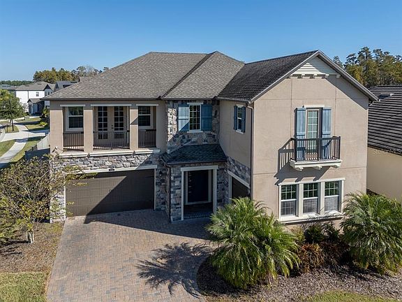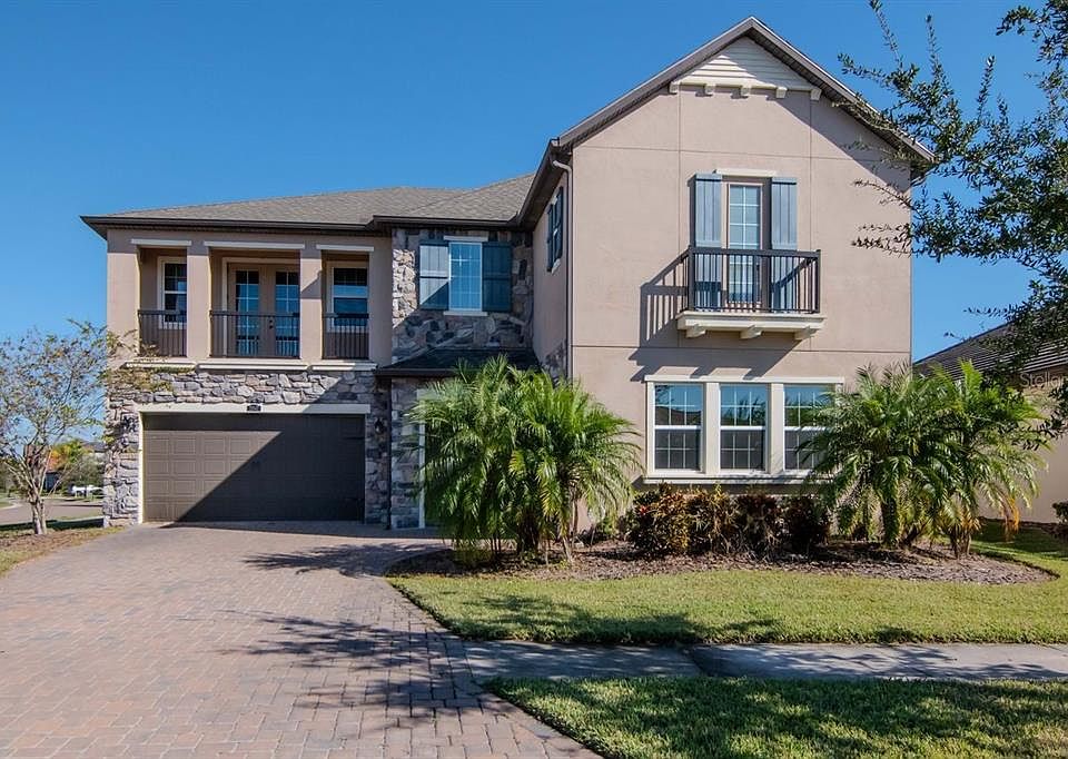 This luxurious, well maintained 5 bedroom/4 bath home with an office and bonus room is a must see. With many upgrades and located in the highly desired neighborhood of Estancia, this home checks off every box and is move-in ready! As you drive up to this beautiful corner lot, the first thing you notice is the elegantly paved driveway, decorative stone adorning the exterior and upstairs balcony. Upon entering, you will notice the high ceilings and the exquisite detail of the custom, wrought iron staircase with gorgeous wooden steps. The first floor features a gourmet kitchen with all stainless steel appliances, gas cook-top, massive center island with seating for 5, pendant lighting , custom espresso cabinets, custom backsplash, separate coffee bar and butler's pantry. The kitchen overlooks the expansive great room where sliding glass doors open to the oversized, screen enclosed back patio. The back patio has a gorgeous view of the fenced in backyard and is pre-wired for fans and surround sound. The upstairs features 3 large bedrooms, master suite, bonus room with balcony and laundry room accessible through master bedroom closet. The master suite features a walk-in closet with custom cabinetry and a master bathroom that is sure to impress. The master bath features an oversized shower with dual shower heads, dual vanity areas and seating area. The bonus room is perfect for any movie lover or gamer. It's already fitted with surround sound and provides perfect space for the entire family to enjoy. This room also features double French doors that lead to the beautiful balcony which allows you to see the gorgeous Florida sunsets. The Community of Estancia is award winning and features amenities such as: community pool with slide, basketball courts, tennis courts, fitness center, playground and so much more. It is conveniently located near I-75 with a quick commute to Tampa and surrounding areas. Close to area restaurants, attractions, Tampa Premium Outlets and Wiregrass mall. This home and community has so many beautiful features and upgrades that it is impossible to list them all. Schedule your showing today.