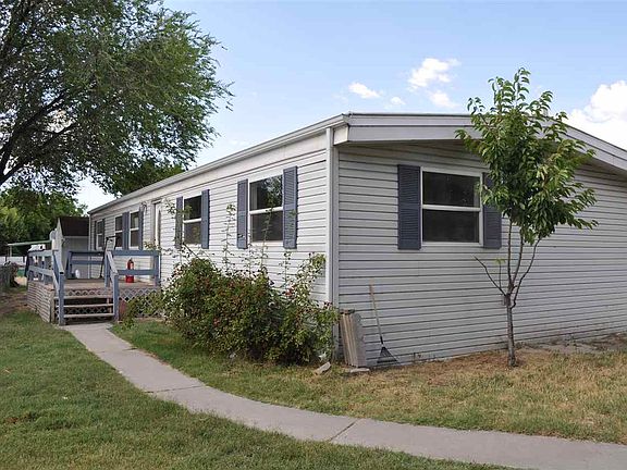 1977 built Manufactured home on its own lot. HOA is $75/year. Large living room with real hardwood floors, dining room with built in storage & hardwood floors, new tile flooring in the kitchen and new epoxy countertops. Split bedroom design with master at front of home with new carpet, new tile flooring in master bath. Spare bedrooms each have new carpet. Main full bath has new tile flooring. Entire interior freshly painted. Fully fenced yard. Alley access. 2 car cement parking pad in front with additional gravel parking. Other upgrades done in the last 3 years: insulated windows, plumbing in from city line to house, plumbing underneath home(insulated), snow capped roof, seamless gutters, replaced swamp cooler, replaced water heater. Buyer to verify all info subj.to change