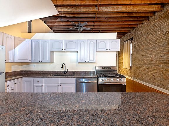 Charming and spacious garden unit in Avondale, featuring exposed brick, wood beam ceilings, and hardwood floors throughout. The open kitchen offers stainless steel appliances, and breakfast bar seating. A large bedroom with ample closet space, modern bathrooms, and in-unit washer/dryer provide both style and convenience. Conveniently located near the Belmont Blue Line with easy access to restaurants, coffee shops, and nightlife in Avondale and Logan Square.