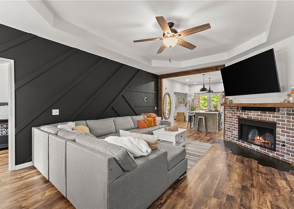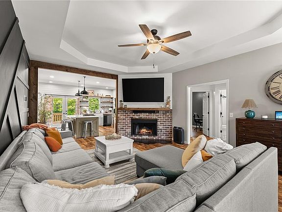 Step inside this beautifully renovated ranch over a full basement, and you're immediately welcomed by a bright, inviting living room featuring an updated brick fireplace with an accent hearth, statement wall, and elegant tray ceiling that adds a touch of modern charm. The space flows seamlessly into a stunning, fully renovated kitchen with shiplap walls, granite countertops, floating shelves, stainless steel appliances, a farmhouse sink, and open views to the family and dining rooms-perfect for gathering with loved ones. Luxury vinyl floors run throughout the home, adding beauty and durability in every room. The airy master suite offers an en-suite bathroom designed for ultimate relaxation, complete with a double vanity, walk-in closet, soaking tub, and tile shower awaiting your final touches. Two spacious secondary bedrooms perfect for any need share a stylishly updated full bath. As you journey downstairs, you will find a complete living suite-currently an active Airbb-features a full kitchen, living room, bathroom, sleeping area with closet, and a secondary laundry room plus abundant storage for all your seasonal items right off the two car garage. Dreaming of space for your own pool? Outside, a large back deck overlooks the fully fenced, grassy yard, perfect for entertaining or peaceful afternoons. All of this sits on just under an acre with a long driveway providing ample parking and room for boats or toys, great for lake enthusiasts with Lake Lanier and boat ramps right down the road. No HOA or restrictions mean you can truly make this property your own.
