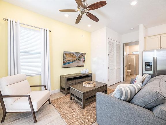 Welcome to 2956 Salted Rim Road, a stunning 2 bedroom, 2 bathroom cottage located in the heart of Margaritaville Resort! This immaculately kept, highly sought after floorplan, rents extremely well and is just moments away from the theme parks. Fully furnished with Margaritaville's signature furniture package and decor, this cottage offers two primary bedrooms, one downstairs and one upstairs, POLLYWOOD balcony furniture off the upstairs bedroom, BOSE IN CEILING SURROUND SOUND, high end wood look tile throughout, upgraded quartz countertops, wooden stairs, oversized private owners closet, high ceilings, and so much more. Step out onto the spacious back patio to relax in your private oasis, or head upstairs to the balcony to watch the beautiful Florida sunsets. This property can be used as a full time residence, second home, short term or long term rental property. This resort style community features two large swimming pools, multiple restaurants and bars, fitness center, full service spa, lush and tranquil walking trails to all ends of the community, as well as a moments walk to all of the restaurants, bars, shops and entertainment that Sunset Walk has to offer! Low maintenance resort living includes fully maintained grounds, home exterior, lawn care, and 24/7 roaming and manned gated security entrance.