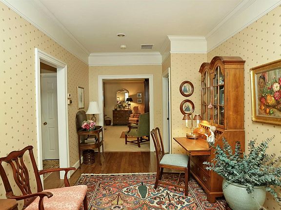 Upgraded first floor unit with added gardens to enhance covered porch and serene setting. Building offers in door mailboxes, elevator to 2 car garage and floored secure storage unit. Gated community. Large rooms, additional hardwood, tall ceilings, original owners.